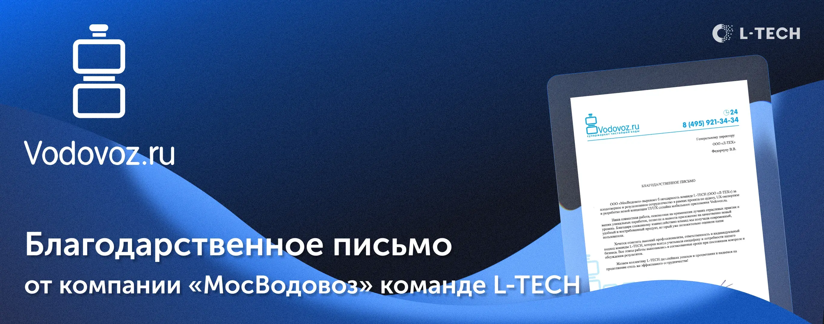 ООО «МосВодовоз» выразило признательность команде L-TECH за успешное сотрудничество в рамках проекта, включавшего аудит, UX-экспертизу и создание новой концепции UI/UX-дизайна для их мобильного приложения.