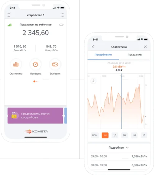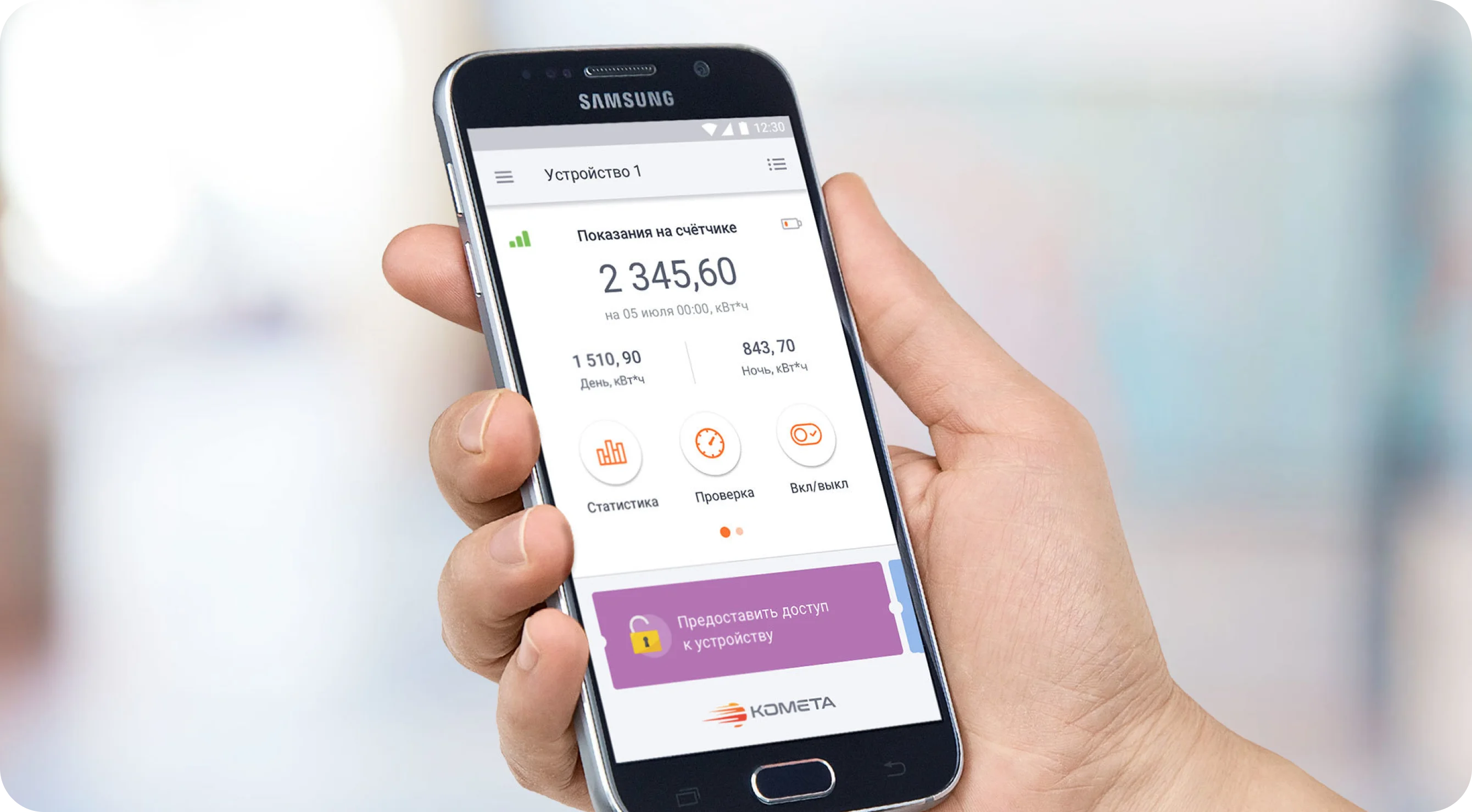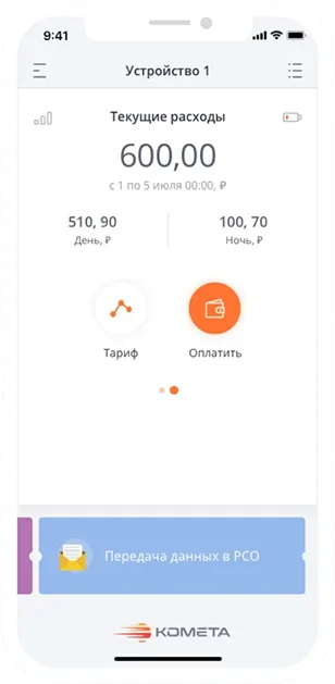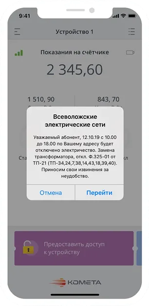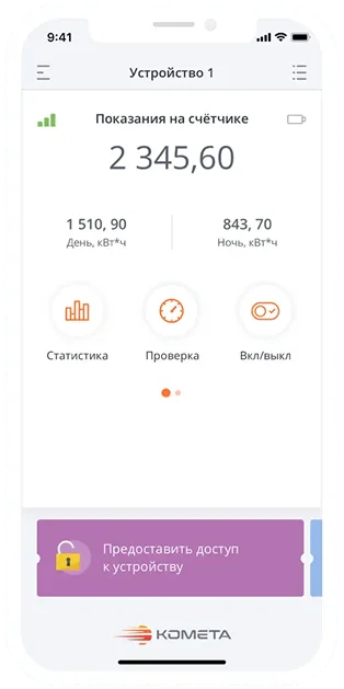 После установки оборудования компании ООО «Комета», пользователь получает SMS-приглашение зарегистрироваться в мобильном приложении «КОМЕТА IoT», где ему будут доступны данные прибора и другие полезные функции. Для быстрого входа в приложение можно впоследствии установить ПИН-код или войти по отпечатку пальца.