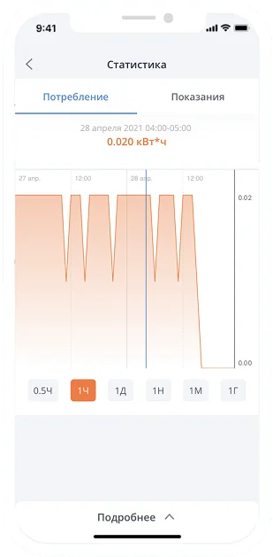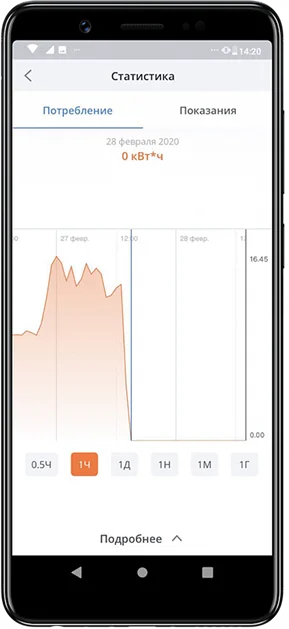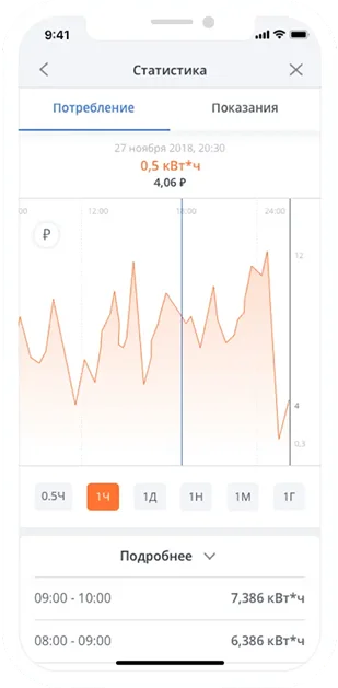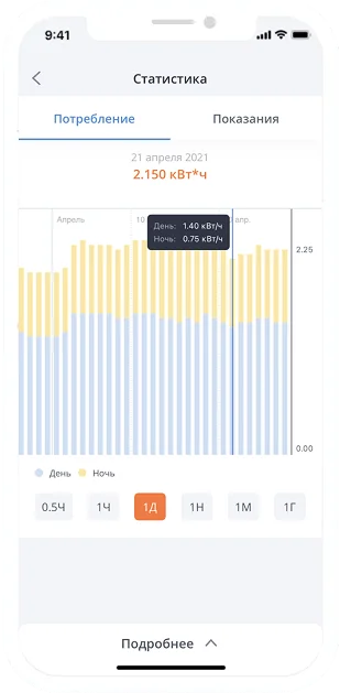 Через приложение можно смотреть текущее потребления ресурсов и анализировать статистику с детализацией до 30 минут. Для этого в разделе «Статистика» необходимо уточнить нужный период, за который нужно посмотреть данные, например «Месяц». Затем активировать кнопку «Подробнее», которая выдаст данные, например, по потреблению электроэнергии по месяцам.