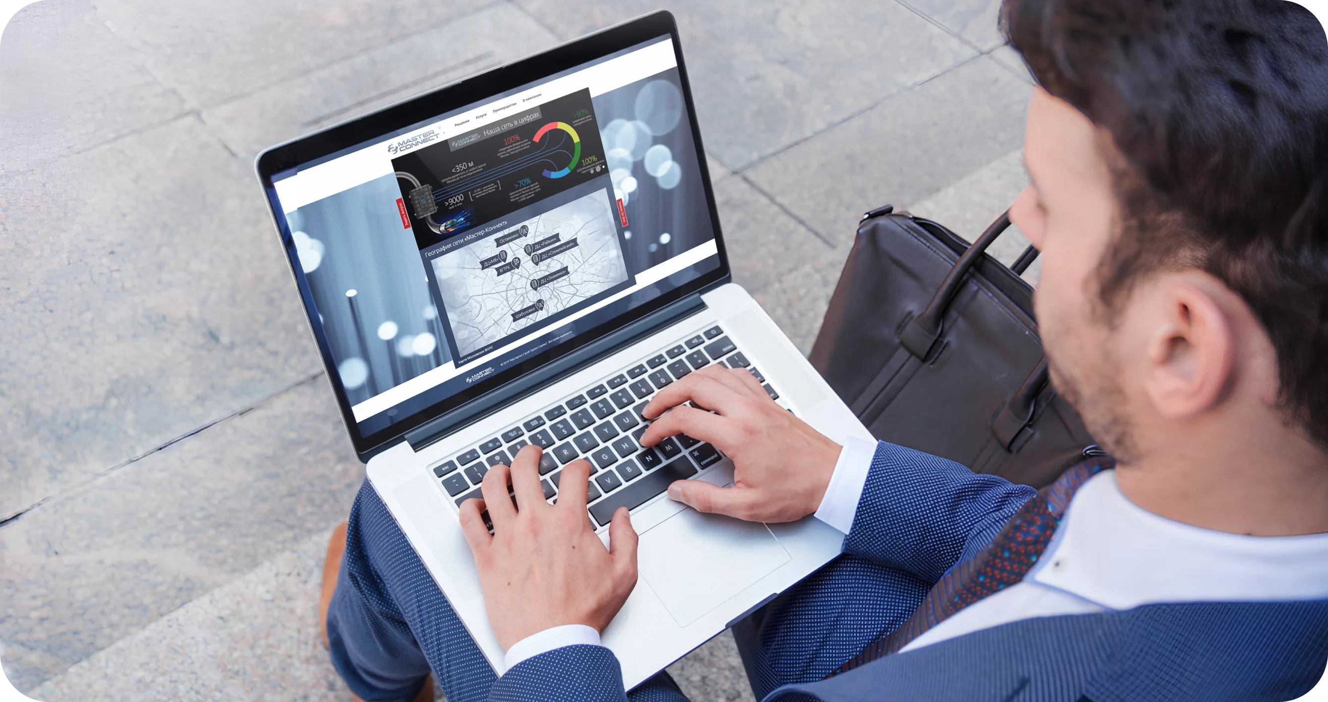 Сайт начинается с большого баннерного слайдера, который сразу задает нужное настроение и показывает, с каким бизнесом пользователь имеет дело. Это своего рода «визуальное приветствие» для посетителя — лаконично, стильно и по делу. Сразу под баннером размещен блок с интерактивной картой московской сети Master-connect.