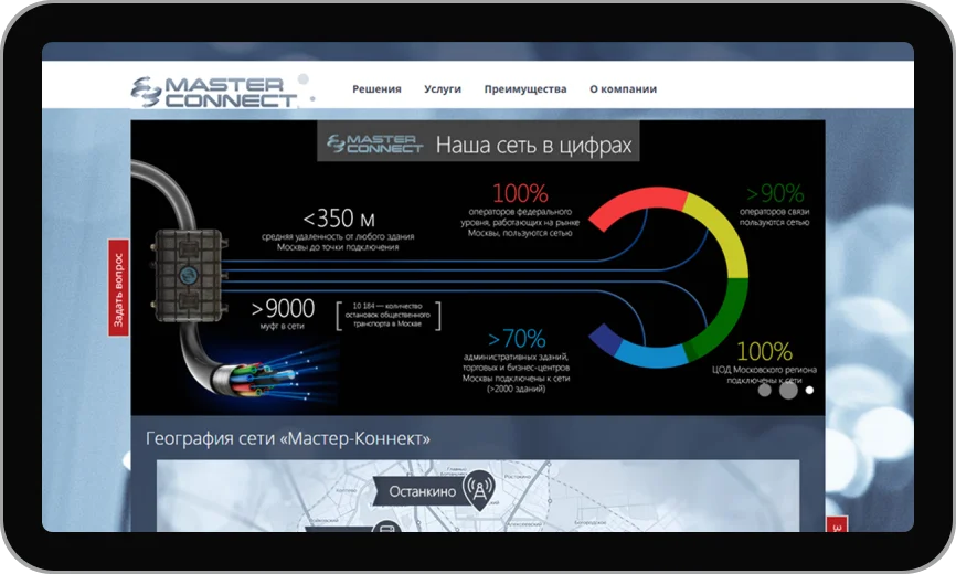 Создание корпоративного web-сайта для Master-connect началось с проектирования его структуры. Эта основа определила, как будут организованы и связаны между собой все компоненты ресурса. Структура включает: главную страницу, информационные разделы с услугами, решениями, преимуществами, а также страницы: «О компании» и «Контакты».