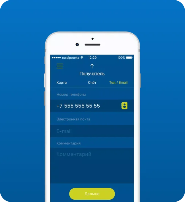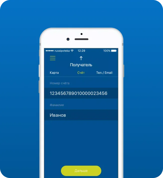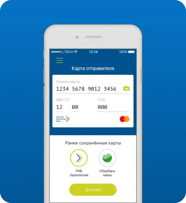 Для совершения денежного перевода требуется ввести реквизиты карт отправителя и получателя (либо отсканировать карточки камерой смартфона). Можно выбрать и другие способы отправки денег:на номер договора онлайн-вклада или накопительного счета в Русском Ипотечном Банке, на номер мобильного телефона и/или e-mail получателя. Затем необходимо указать сумму перевода и подтвердить операцию вводом секретного пароля (технология 3-D Secure).